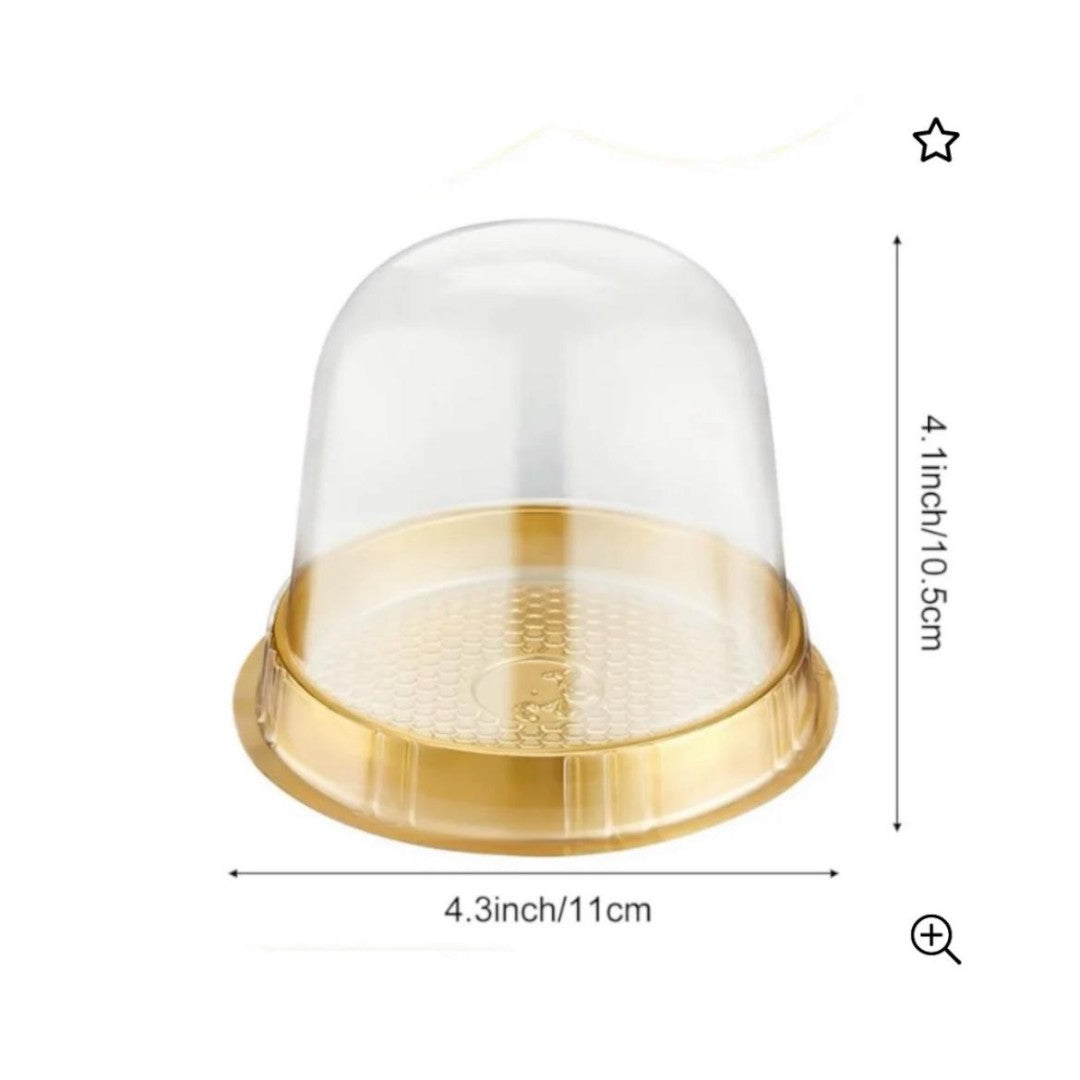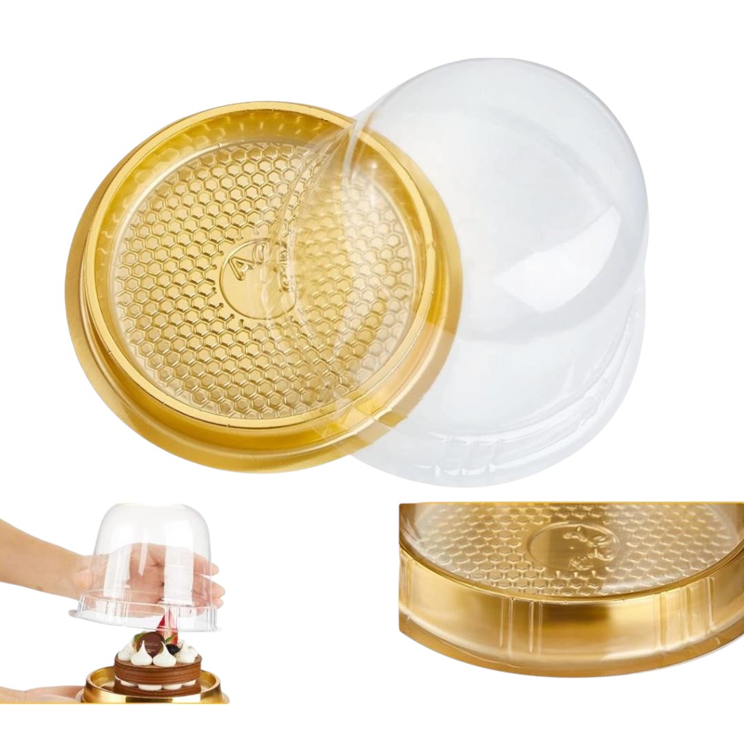 ¡Celebra en grande y con elegancia! Este domo transparente con base dorada es el empaque ideal para tortas individuales, mini pasteles, postres decorativos y creaciones de repostería o chocolatería de mayor volumen. Su cierre tipo presión asegura una presentación impecable y protegida.