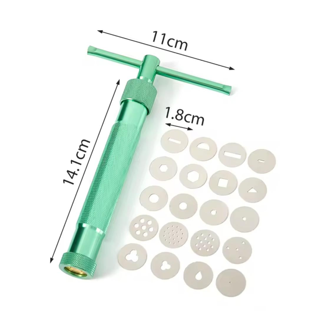¡Detalles perfectos sin esfuerzo! Esta extrusora manual es ideal para crear cordones, hilos, trenzas, pasto, cabello y formas decorativas en fondant, pasta de goma, mazapán o masa flexible.