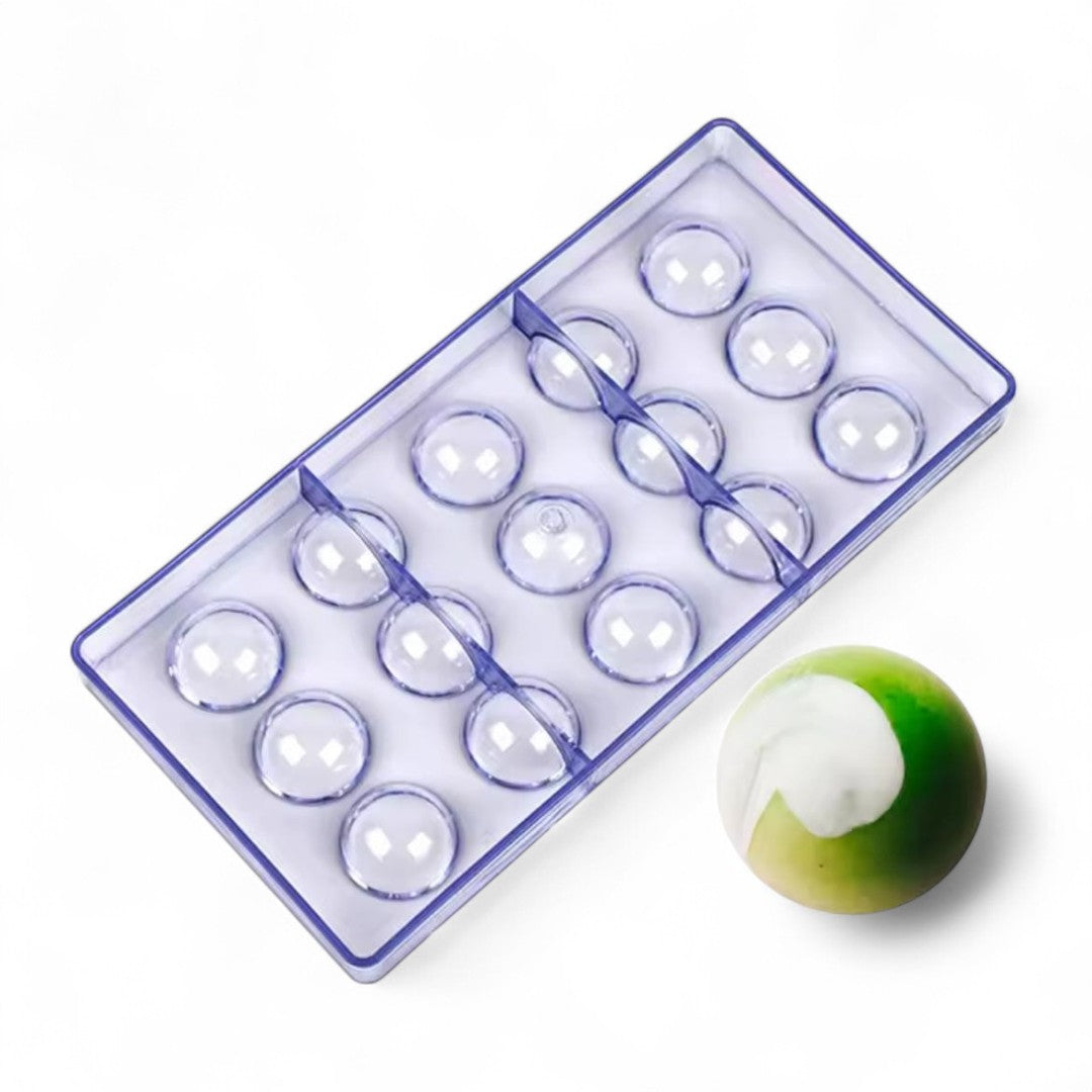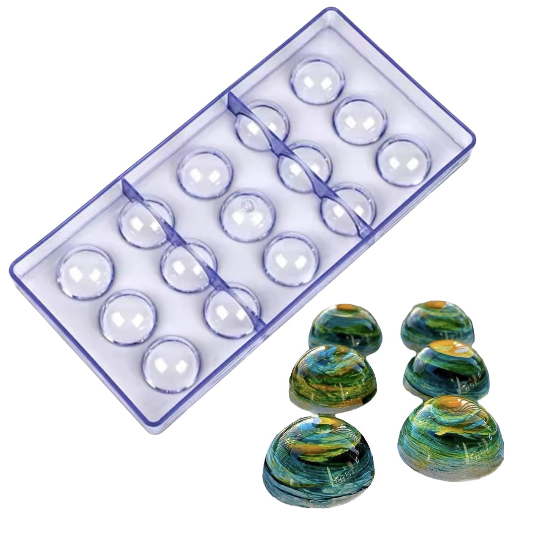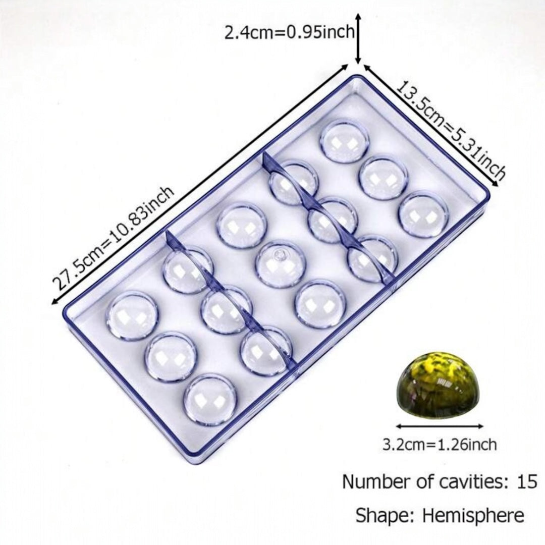 ¡Luce tus creaciones como un profesional! Este molde de policarbonato en forma de semiesfera es ideal para bombones rellenos, trufas, esferas decorativas y mucho más. Su material rígido permite un desmolde perfecto y un acabado brillante que eleva cualquier creación de chocolatería o repostería fina.