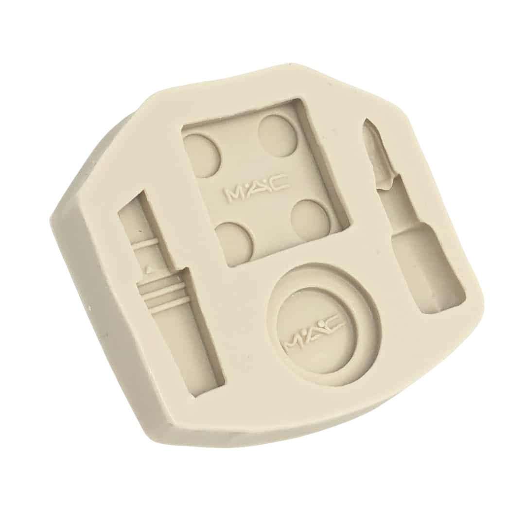 ¡Que brille el glamour en tus postres! Este fabuloso molde push con temática de maquillaje MAC es perfecto para crear figuras como labiales, brochas, polvos y compactos en fondant, chocolate, mazapán o resina.