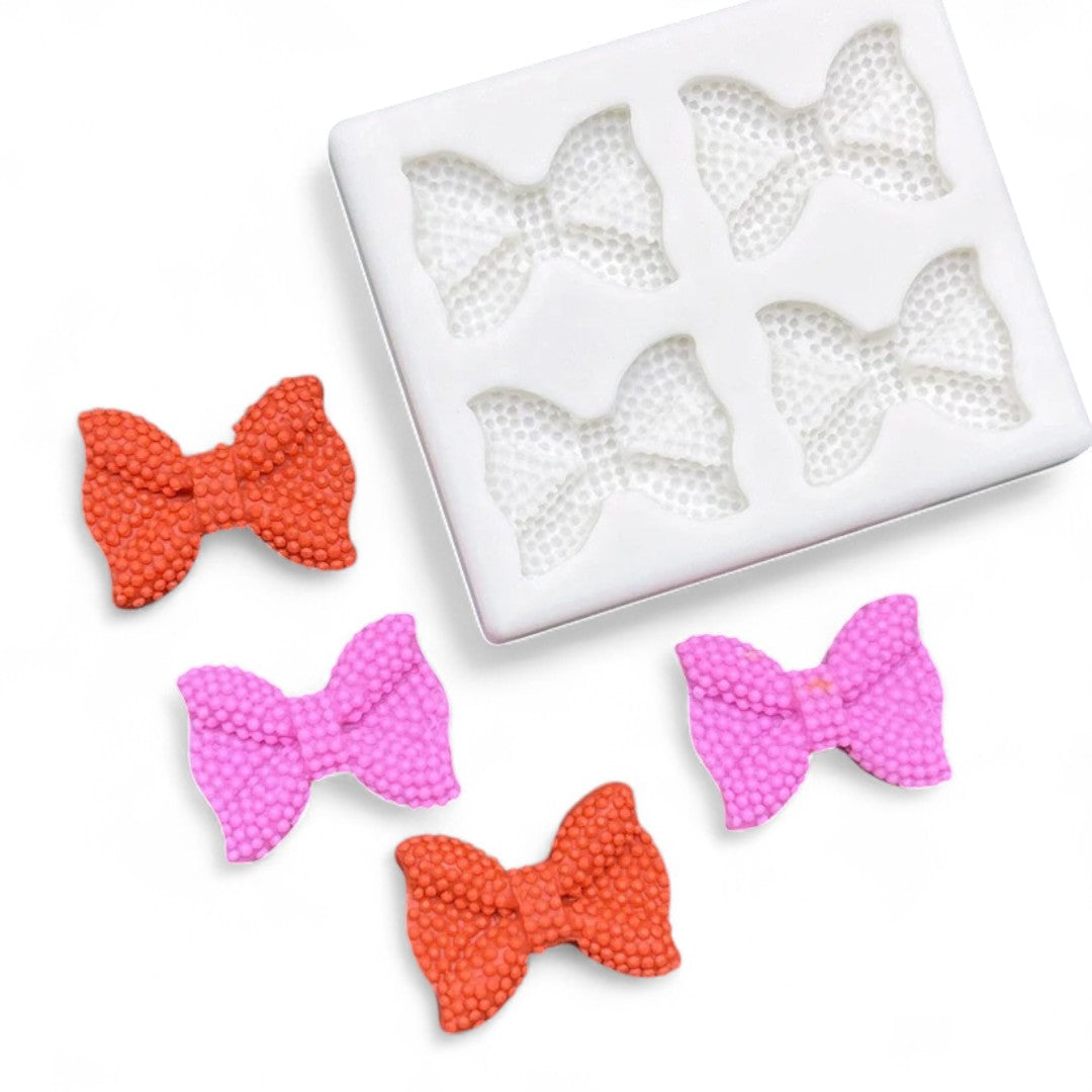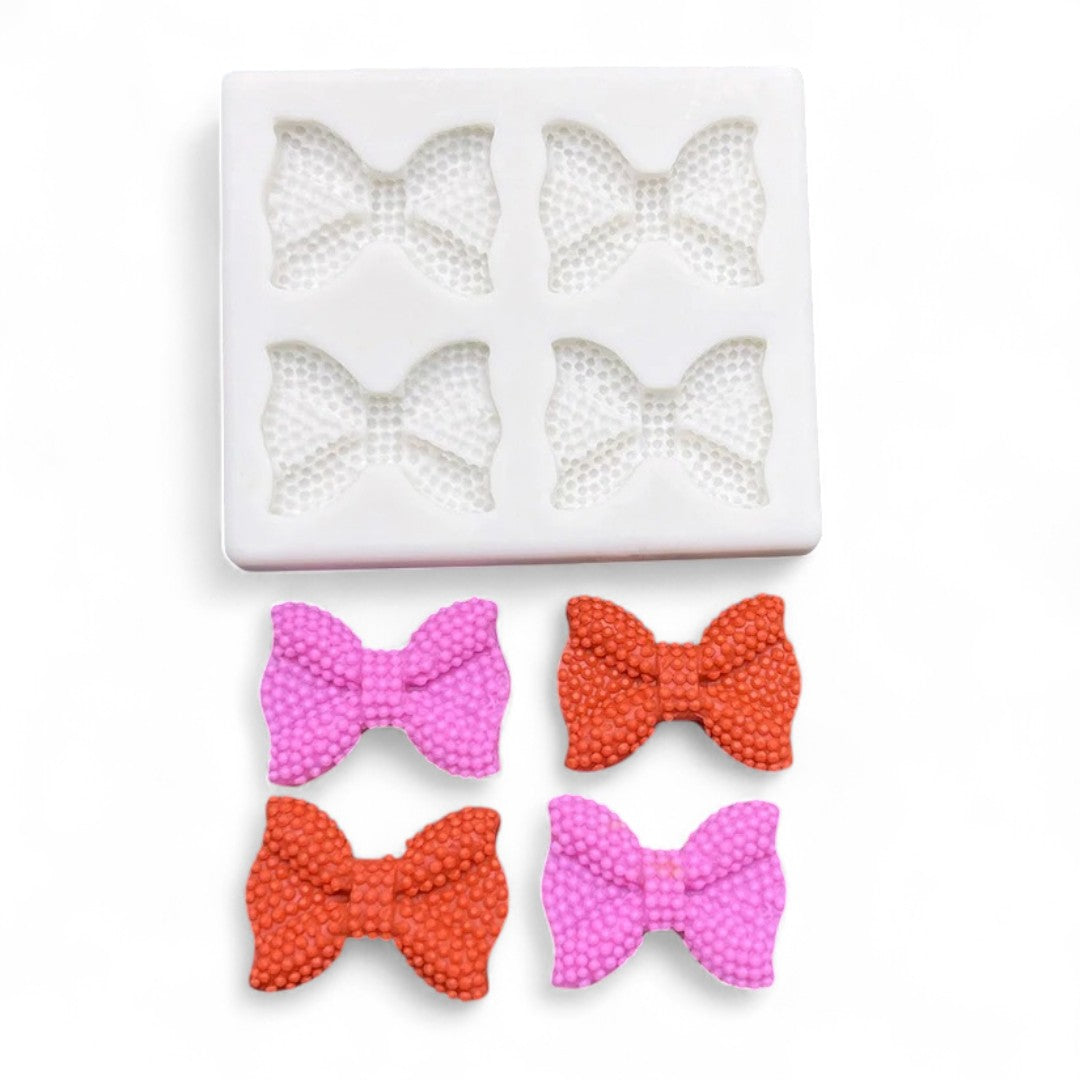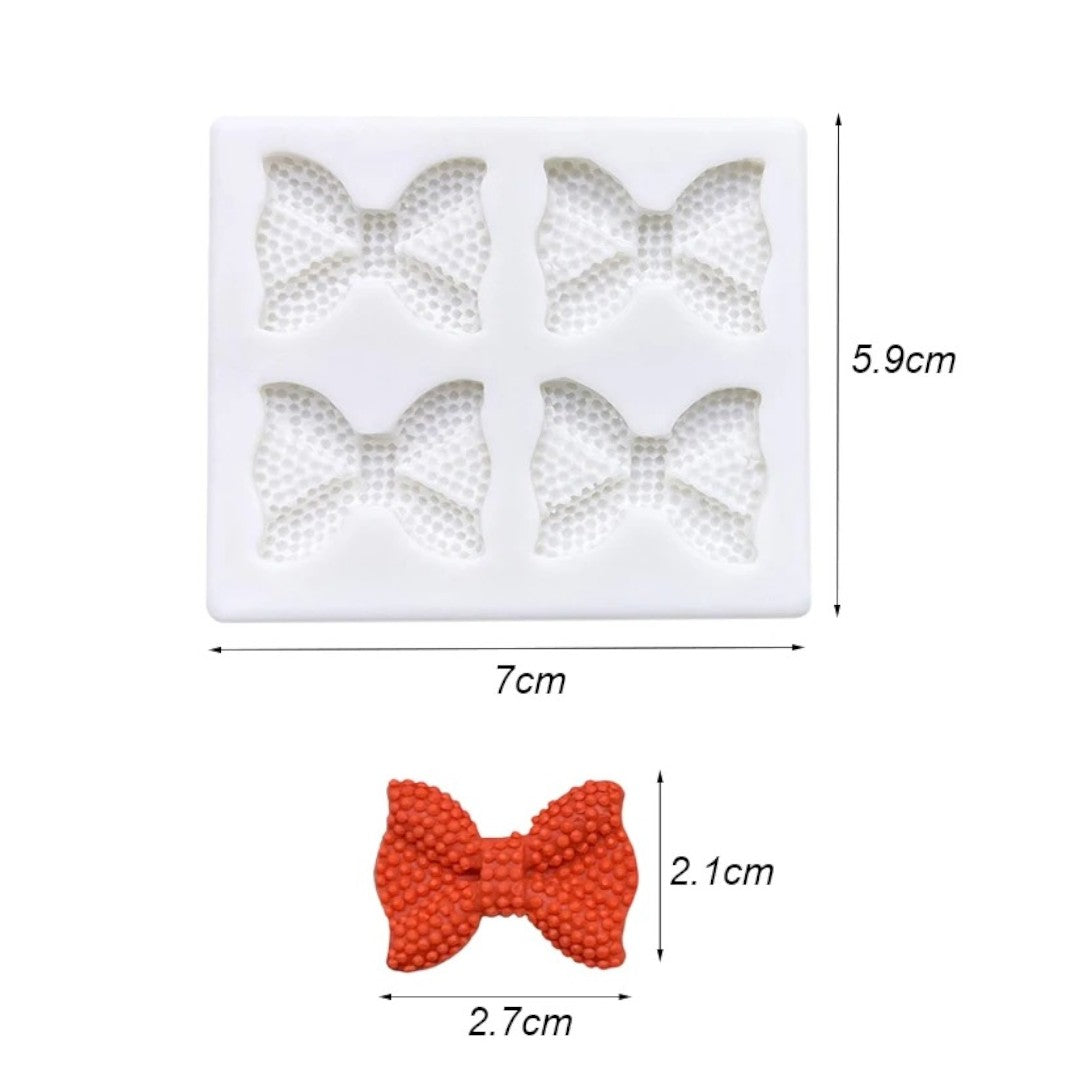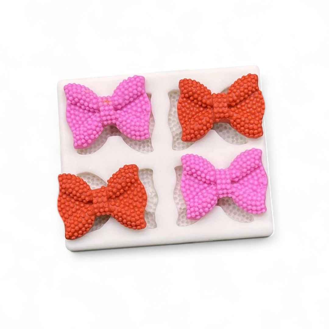🎀✨ ¡Dale el toque final con estilo! El Molde Silicona Moños Textura x 4 incluye cuatro cavidades con moños del mismo diseño y tamaño, todos con una textura delicada que imita el plisado de tela, ideal para decorar con un acabado elegante y detallado.