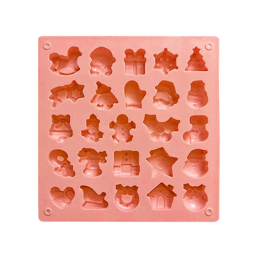 ¡Haz que cada bocado sea una fiesta navideña! Con este adorable molde de silicona podrás crear 25 mini figuras llenas de encanto: árboles, copos de nieve, renos, estrellas, campanas, muñecos...
