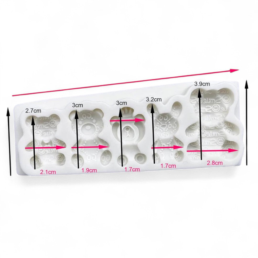 🧸 ¡Textura, ternura y dulzura en un solo molde! El Molde de Silicona Osos con Textura x 5 es ideal para crear apliques decorativos adorables con detalle en relieve, incluyendo mensajes como “Smile” y “Go”. Este molde es perfecto para fondant, chocolate, pasta de goma o mazapán, y da vida a ositos encantadores que harán destacar cualquier torta, cupcake o fresa decorada.