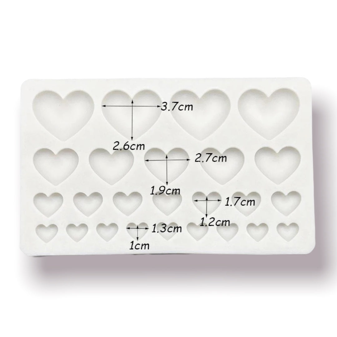 ❤️✨ ¡Un molde, múltiples tamaños, mil ideas! Este molde de silicona tipo placa con 25 cavidades de corazones presenta el mismo diseño repetido en 4 tamaños distintos, lo que lo hace ideal para crear composiciones armoniosas y variadas en fondant, chocolate, pasta de goma, mazapán o incluso resina y jabón artesanal.