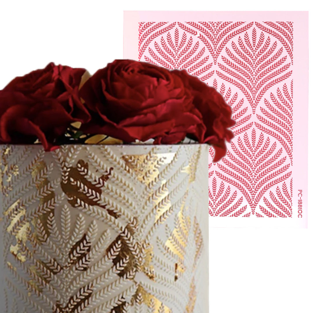 ¡Texturas perfectas con solo aplicar y levantar! El stencil con diseño de espiga es ideal para dar un acabado elegante y uniforme a tus tortas, galletas, brownies o postres decorados con aerógrafo, glaseado real, royal icing, polvo matizante o mantequilla.